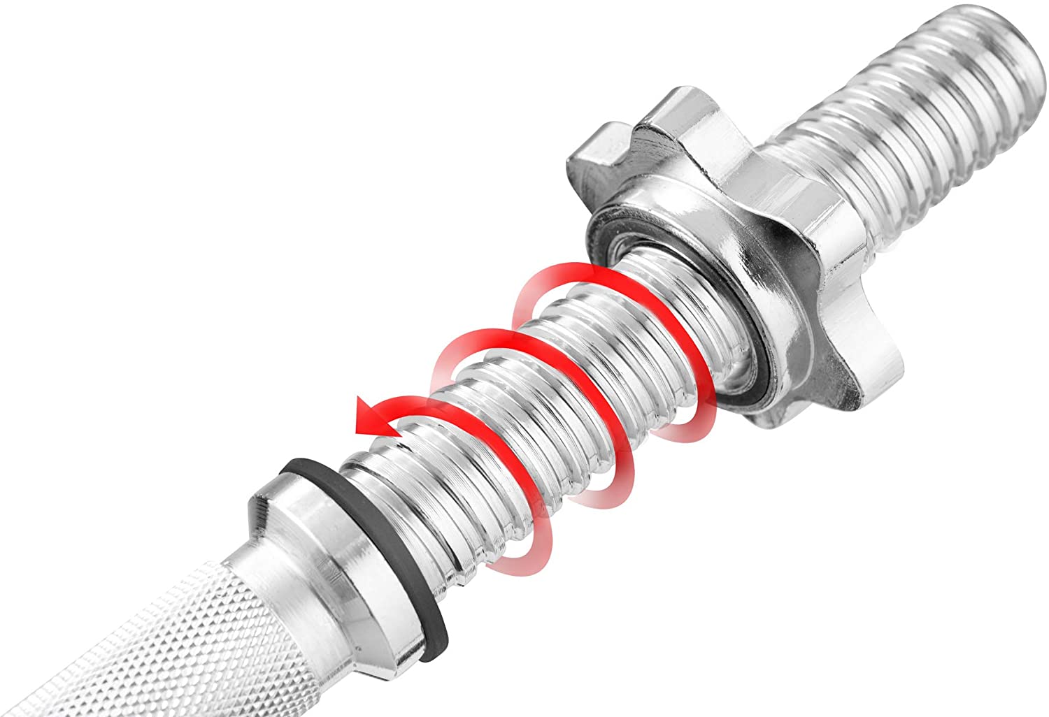 The Standard straight threaded chrome bar features a fully threaded weight sleeve on each end and a pair of star-locking collars. Weight plates slide onto these bars just as easily as regular non-threaded bars. Weight plates are held securely in place while working out via two-star lock collars included with each bar. Threaded barbell collars pose no risk of sliding off during workouts and keep the entire barbell safe and secure.
